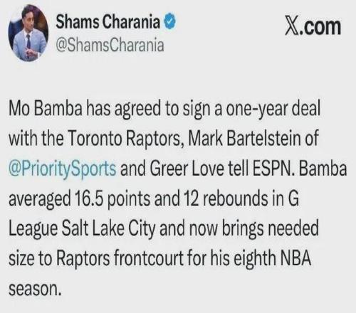 爆料王Shams:班巴以一年合同加盟猛龍。猛龍隊記Murphy對此表示,班巴的合同為無保障,本質(zhì)上是一份為期12天的短合同。