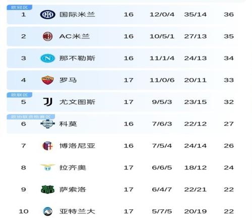 而衛(wèi)冕冠軍那不勒斯34分屈居第3位,羅馬和尤文分別積33分和32分,排名第4和第5位,尤文則領(lǐng)先身后的第6名科莫隊多達(dá)5分。