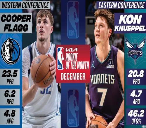 北京時(shí)間今日,NBA官方公布了12月最佳新秀,獨(dú)行俠隊(duì)狀元秀庫珀-弗拉格和黃蜂隊(duì)4號(hào)秀康-克努佩爾當(dāng)選,這也是二人連續(xù)第二個(gè)月榮獲該獎(jiǎng)項(xiàng)。