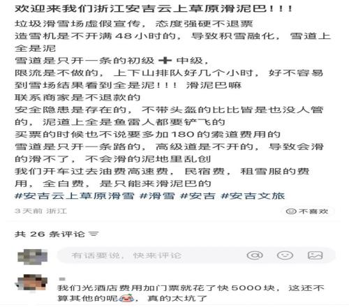 前不久,去浙江安吉“云上草原”滑雪的游客紛紛表示“被坑慘了”。因?yàn)闅鉁剡^高、客流量大等原因,融化的雪道讓游客們的體驗(yàn)大打折扣。云上草原景區(qū)不得不發(fā)出道歉公告,并承諾補(bǔ)送給游客們一張兩日滑雪票。