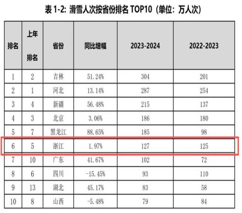 浙江滑雪人次在全國省份排名第六。(圖/《2023—2024中國滑雪產(chǎn)業(yè)白皮書》截圖)