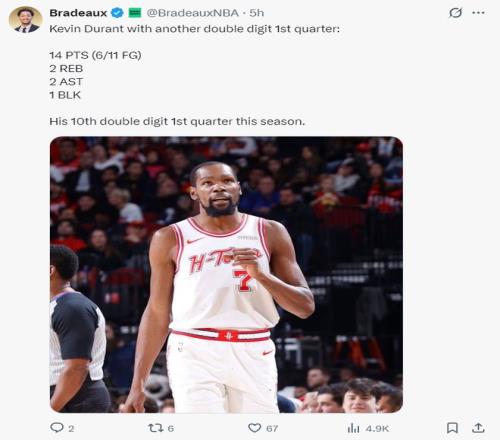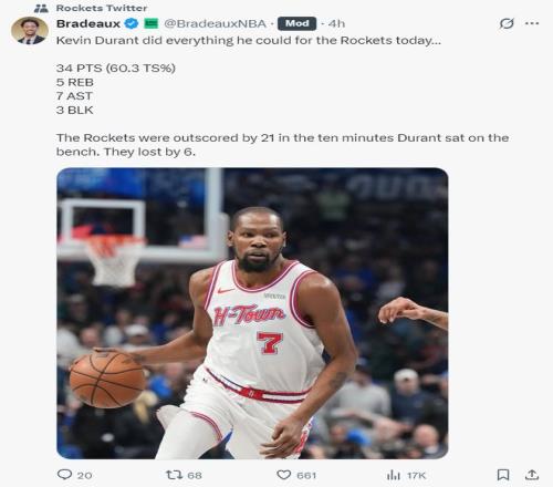 火箭記者:杜蘭特下場(chǎng)的幾分鐘獨(dú)行俠凈勝火箭21分之多,最終火箭只輸了6分。