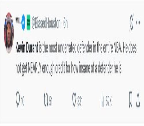 休媒:杜蘭特整個(gè)生涯都是最被低估的防守球員。他作為防守球員的出色表現(xiàn)遠(yuǎn)未得到應(yīng)有的認(rèn)可。