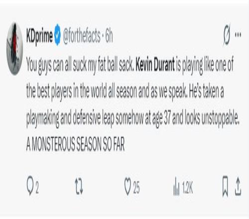 杜蘭特球迷組織:杜蘭特整個(gè)賽季的表現(xiàn)堪稱世界最頂級(jí),這場(chǎng)比賽也如此。他以 37 歲的高齡在傳球能力和防守能力上都有提升,本賽季看起來(lái)勢(shì)不可擋。迄今為止,他打出了一個(gè)極其出色的賽季。
