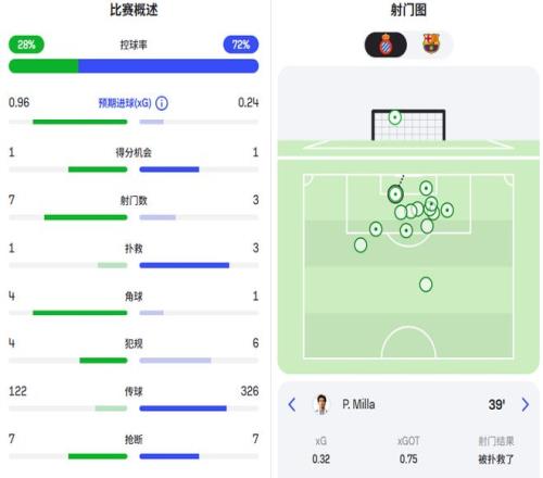 從上半場統(tǒng)計數據看,西班牙人的預期進球高達0.96,巴薩僅有0.24。西班牙人沒能收獲進球,完全是因為喬安加西亞的神撲。