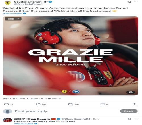 北京時(shí)間1月2日下午,法拉利F1車隊(duì)在其官方社媒發(fā)文,感謝周冠宇過去一年作為替補(bǔ)車手的付出,祝愿他未來順利。周冠宇在其下留言道:“謝謝!祝一切順利,下次見!”