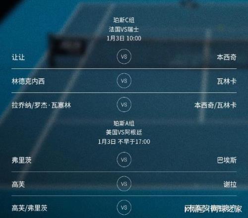 珀斯賽區(qū)的法國(guó)隊(duì)與瑞士隊(duì)的較量在北京時(shí)間今天上午10點(diǎn)打響,雙方的對(duì)陣是:讓讓 vs 本西奇、林德克內(nèi)西 vs 瓦林卡、拉喬納/羅杰-瓦塞林 vs 本西奇/瓦林卡。截至發(fā)稿時(shí),瑞士隊(duì)依靠本西奇兩盤獲勝,取得1-0的領(lǐng)先。 北京時(shí)間今天下午2點(diǎn)半和5點(diǎn)時(shí)段,還有澳大利亞vs 挪威和美國(guó)vs 阿根廷兩場(chǎng)較量,其中小野兔對(duì)決魯?shù)?、弗里茨PK巴埃斯、高芙對(duì)陣謝拉等場(chǎng)次引人關(guān)注。