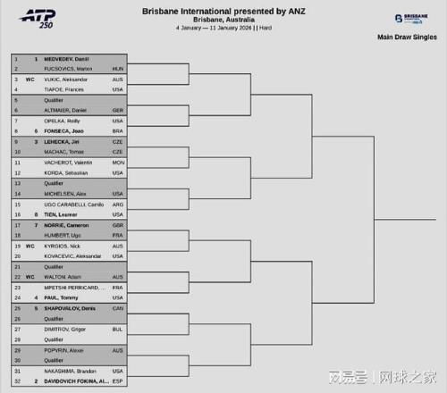 我們?cè)賮?lái)關(guān)注賽事簽表。北京時(shí)間昨晚,下周開(kāi)打的三站賽事相繼公布了正賽簽表。其中,ATP250布里斯班站由俄羅斯名將梅德維德夫領(lǐng)銜,西班牙人弗基納、捷克人萊赫卡和美國(guó)人保羅分列2-4號(hào)種子;沙波瓦洛夫、豐塞卡等人也將參賽,澳大利亞壞小子克耶高斯持外卡在本站復(fù)出,首輪對(duì)陣美國(guó)人科瓦切維奇;梅總和椰子分處上下半?yún)^(qū),如想交手,必須各自打進(jìn)決賽。