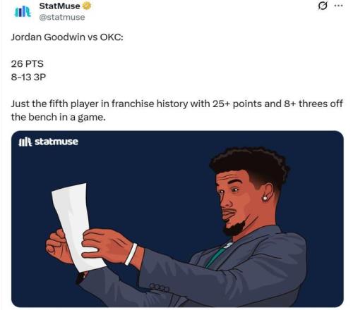 古德溫本場(chǎng)也用行動(dòng)回報(bào)太陽(yáng)隊(duì)的信任,替補(bǔ)16中9,三分13中8,爆砍26分4板,成為太陽(yáng)隊(duì)掀翻雷霆的最大功臣之一。