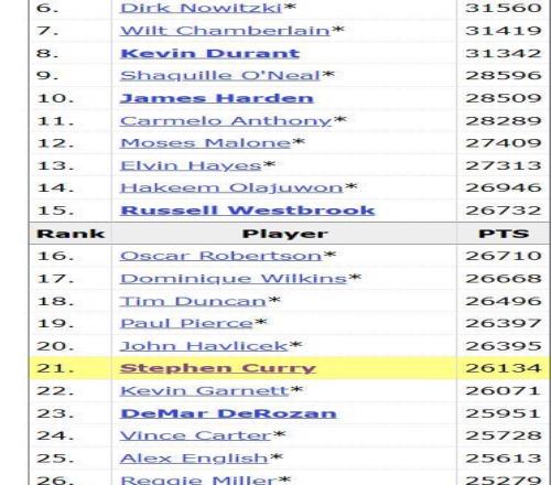 目前庫里以26134分排名歷史第21位,距離第20的綠軍名宿哈弗里切克僅差261分。