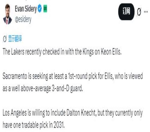 北京時間1月7日,據(jù)名記Sidery報道,湖人隊最近就基翁-埃利斯一事與國王隊進行了談判。國王希望用埃利斯換來至少一個首輪簽,埃利斯被認為是一名遠高于平均水平的3D后衛(wèi)。湖人愿意將克內(nèi)希特加入交易,但他們目前只有2031年一個可交易的首輪簽。