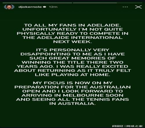 “很遺憾,我的身體狀態(tài)尚未準(zhǔn)備好參加下周的阿德萊德國(guó)際賽。 這對(duì)我個(gè)人而言非常令人失望,因?yàn)槲覍?duì)兩年前在那里奪冠的經(jīng)歷仍記憶猶新。我原本對(duì)重返賽場(chǎng)滿懷期待,那里于我而言就像主場(chǎng)一樣。 如今我的重心已放在澳網(wǎng)的備戰(zhàn)上,我期待很快抵達(dá)墨爾本,與澳大利亞所有的網(wǎng)球迷相見(jiàn)?!钡录s科維奇在聲明中坦率地表達(dá)了身體狀態(tài)未達(dá)最佳的事實(shí)。