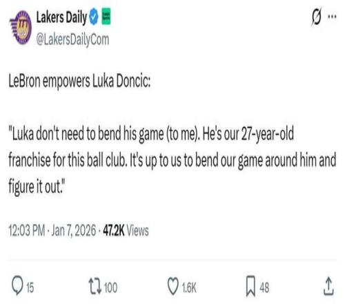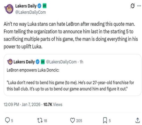湖人媒體Lakers Daily坦言:“東契奇球迷聽(tīng)到這一番話后,不可能再討厭詹姆斯了,從球隊(duì)介紹首發(fā)五虎時(shí)將東契奇放在最后,到犧牲各方面適應(yīng)東契奇,勒布朗竭盡全力來(lái)提升盧卡的地位?!?/p>