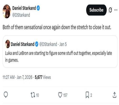 正如湖人記者Daniel Starkand賽后所說(shuō):“詹姆斯與東契奇正在適應(yīng)彼此,他們又一次在比賽收官階段攜手幫助球隊(duì)鎖定勝局?!?/p>