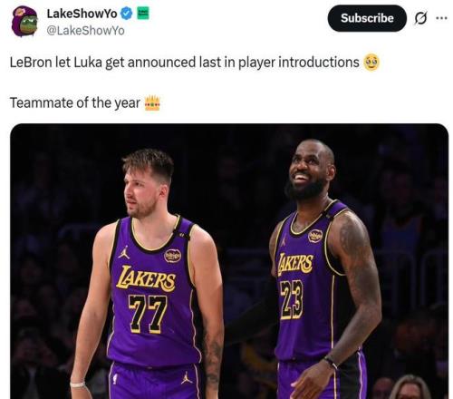 不僅是賽后公開(kāi)稱贊東契奇是球隊(duì)核心,根據(jù)美媒LakeShowYo報(bào)道,在賽前介紹球員入場(chǎng)時(shí),詹姆斯也讓東契奇最后一個(gè)壓軸出場(chǎng)。
