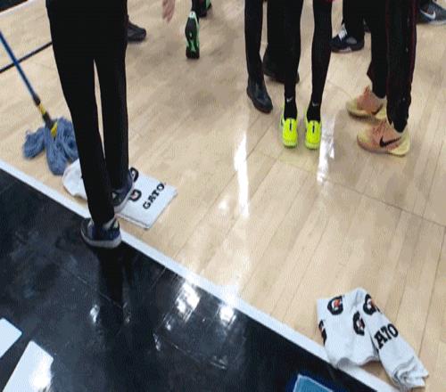 然后,你看到裁判和工作人員開(kāi)始反復(fù)彎下腰,用手觸摸地板,表情凝重。接著,一群保潔人員拿著拖把進(jìn)場(chǎng),開(kāi)始一遍又一遍地擦拭。你等了半小時(shí),一小時(shí),一個(gè)半小時(shí)……大屏幕上始終沒(méi)有出現(xiàn)跳球倒計(jì)時(shí),只有工作人員不知疲倦的擦地身影。