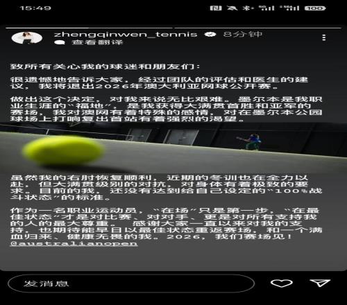 鄭欽文在社交媒體上表示:“致所有關(guān)心我的球迷和朋友們,很遺憾地告訴大家,經(jīng)過團隊的評估和醫(yī)生的建議,我將退出2026年澳大利亞網(wǎng)球公開賽。”