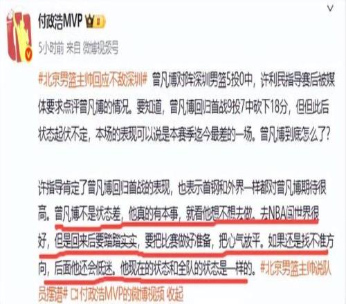 那么問題來,許利民究竟說的是哪位明星球員耍大牌,不踏實(shí)打球呢?在北京隊(duì)談得上的明星球員是周琦、趙睿和曾凡博。但趙睿因傷不打比賽,那明星球員就只有周琦和曾凡博了。許利民在記者的誘導(dǎo)下點(diǎn)出了曾凡博的名字。許利民首先肯定了曾凡博回歸首戰(zhàn)的表現(xiàn),他表示首鋼和外界一樣都對曾凡博期待很高。曾凡博不是狀態(tài)差,他真的有本事,就看他想不想去做。去NBA闖世界很好,但是回來后要踏踏實(shí)實(shí),要把比賽做好準(zhǔn)備,從什么地方開始做。如果他還是找不準(zhǔn)方向,后面他還會低迷。他現(xiàn)在的狀態(tài)和全隊(duì)的狀態(tài)是一樣的。