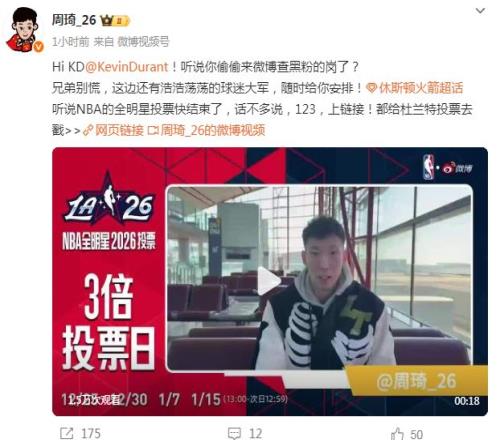 至于如今周琦則是給杜蘭特拉票,他錄制視頻搖旗吶喊,還寫道:“Hi KD@KevinDurant!聽說你偷偷來微博查黑粉的崗了?兄弟別慌,這邊還有浩浩蕩蕩的球迷大軍,隨時給你安排!”