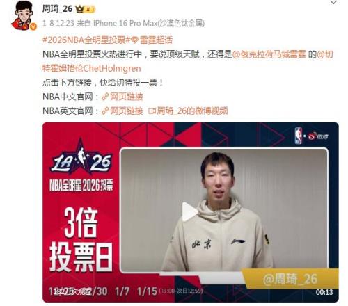 周琦先是在1月8日給同為“竹竿人”的雷霆總冠軍球員霍姆格倫拉票,周琦拍攝視頻拉票,同時還寫道:“NBA全明星投票火熱進(jìn)行中,要說頂級天賦,還得是@俄克拉荷馬城雷霆 的@切特霍姆格倫ChetHolmgren。”
