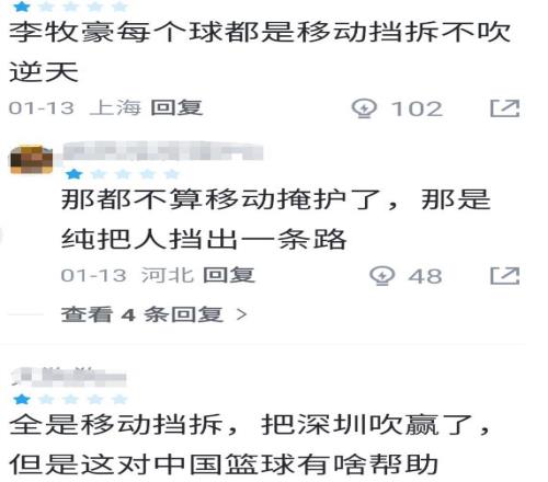 其實上海爆冷輸給深圳的那場比賽,上海球迷也是相當(dāng)不服氣的,怨聲很大,不少球迷在賽后瘋狂指責(zé)裁判和李慕豪,認為裁判縱容了李慕豪的多次移動掩護,才導(dǎo)致上海輸了比賽,甚至還有球迷說:這場裁判這么吹,美國隊來了也只能險勝深圳;國家隊有你這擋拆,早就進世界杯了。